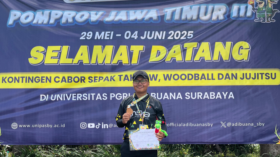 Prestasi membanggakan kembali ditorehkan oleh mahasiswa Universitas Islam Kadiri (UNISKA) Kediri dalam ajang Pekan Olahraga Mahasiswa Provinsi Jawa Timur (Pomprov) III Tahun 2025. Kharis Hanafi, mahasiswa semster 6, Program Studi Teknik Elektro (Fakultas Teknik), berhasil meraih medali perunggu pada cabang olahraga Woodball, nomor pertandingan Men Single Fairway Competition. Foto : UNISKA Kediri