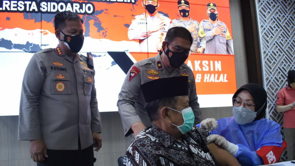 Di Sidoarjo, bertempat di Gedung Satlantas Polresta Sidoarjo juga dilakukan vaksinasi booster dosis ke tiga bagi lansia, Selasa (8/2/2022). Dihadiri Wakapolda Jawa Timur Brigjen Pol. Slamet Hadi Supraptoyo dan Kapolresta Sidoarjo Kombes Pol. Kusumo Wahyu Bintoro, yang sebelumnya mengikuti zoom meeting vaksinasi serentak bersama Kapolri.
