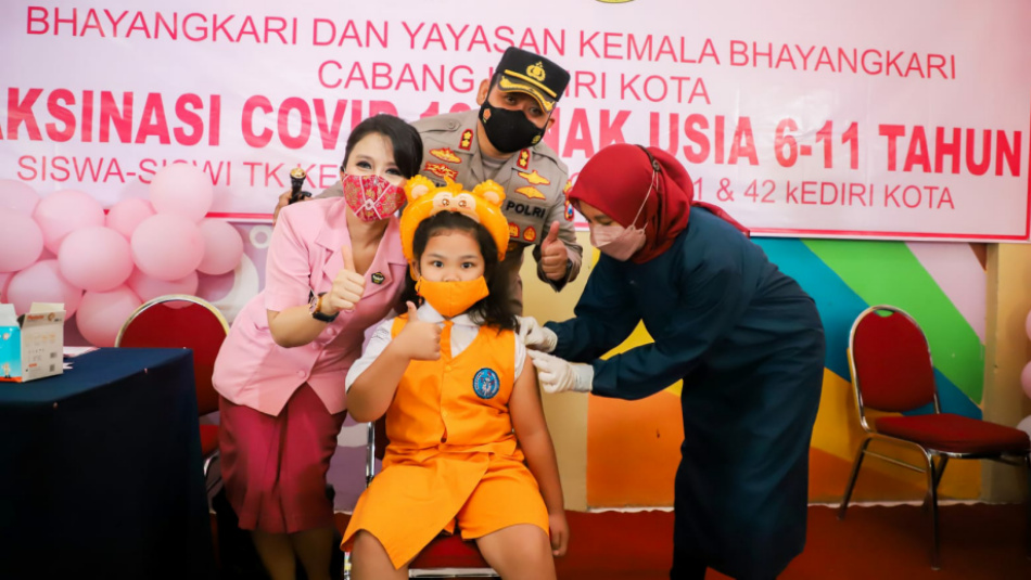 “Agar pembelajaran tatap muka bisa berjalan dengan lancar dan aman maka kita bersama Polres Kediri Kota menggelar Vaksinasi hari ini yang diikuti siswa-siswi TK Kemala Bhayangkari 41 dan 42 Kediri Kota,” tuturnya.