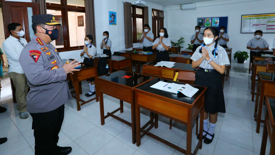 Kapolri Jenderal Listyo Sigit Prabowo melihat penerapan penegakan protokol kesehatan (prokes) proses Pembelajaran Tatap Muka (PTM) di SMP Kristen 1 Harapan, Kota Denpasar, Bali. Hal itu dilakukan untuk memastikan, para siswa dan pengajar terlindungi dari paparan Covid-19 serta tidak terjadi transmisi saat kembali ke keluarga. Foto : Humas Polri