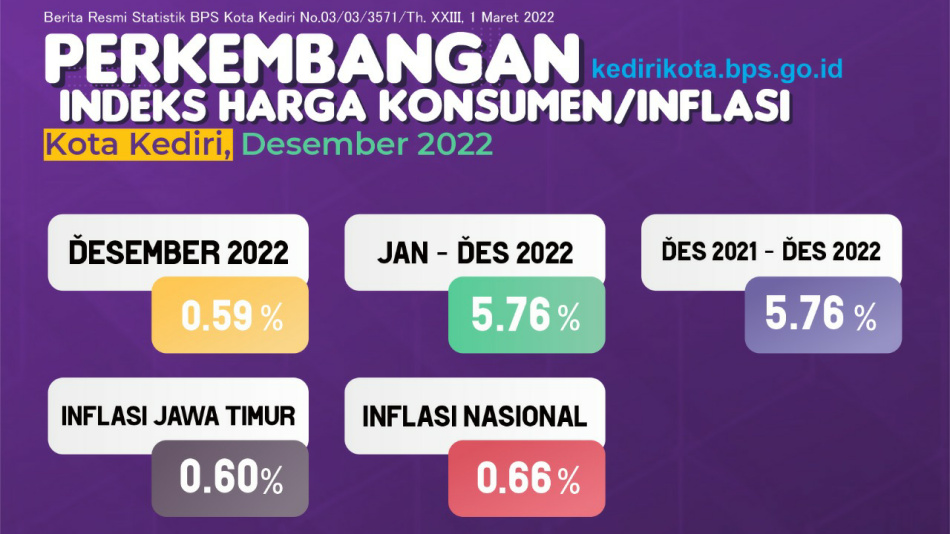 Perkembangan Indeks Harga Konsumen (IHK) Kota Kediri pada bulan Desember 2022 masih berada dalam level terkendali. Berdasarkan data dari Badan Pusat Statistik (BPS) Kota Kediri pada Desember tahun lalu tercatat tingkat inflasi Kota Kediri sebesar 0,59% secara mtm atau sebesar 5,76% secara yoy. Foto : Dinas Komunikasi dan Informatika Kota Kediri