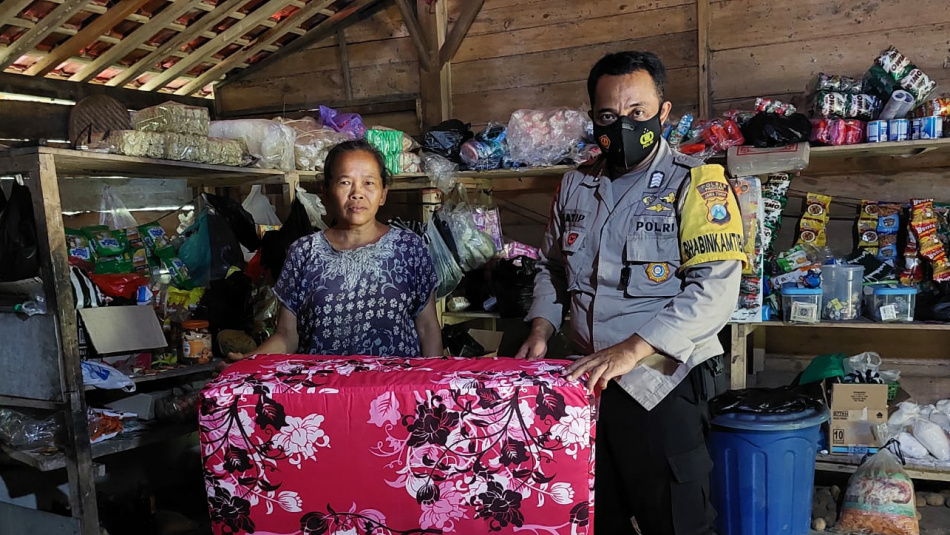 Bripka Latip Utomo Bhabinkamtibmas Desa Kalikuning Kecamatan Tulakan kembali berbagi kebahagiaan kepada warganya dengan memberikan kasur dan uang kepada penyandang disabilitas saraf otak Murti (36), warga Desa Kalikuning, Kecamatan Tulakan. Foto : Humas Polri