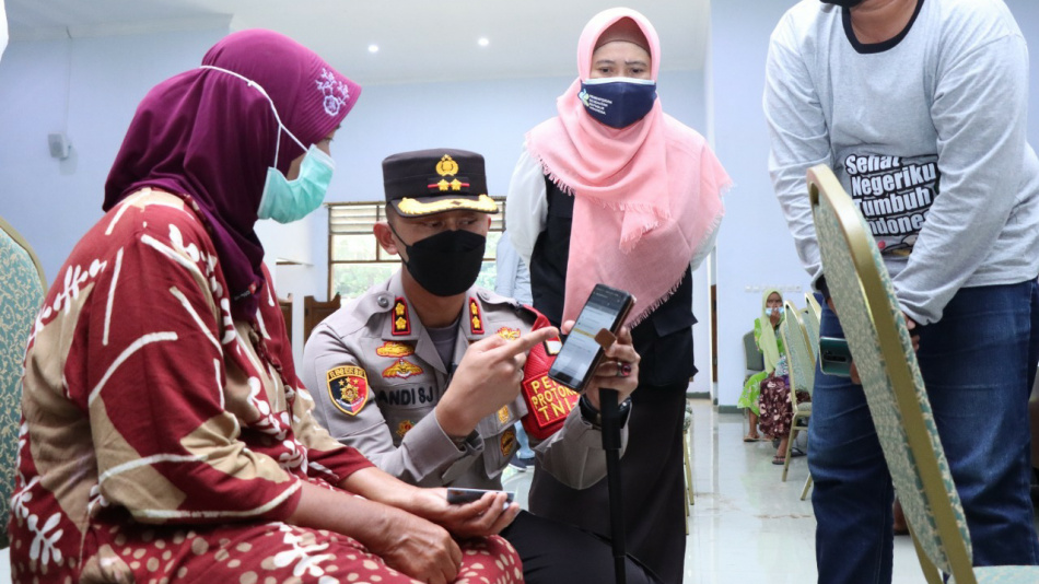 Kapolres Situbondo AKBP Dr. Andi Sinjaya, memberikan penjelasan kepada seorang ibu peserta vaksin tentang cara mendaftar aplikasi PeduliLindungi. Momen ini terjadi saat peninjauan vaksinasi bersama Forkopimda di gerai vaksin di wisma Bhayangkara Kawasan Wisata Bahari Pasir Putih Situbondo, Rabu (19/1/2022). Foto : Humas Polri