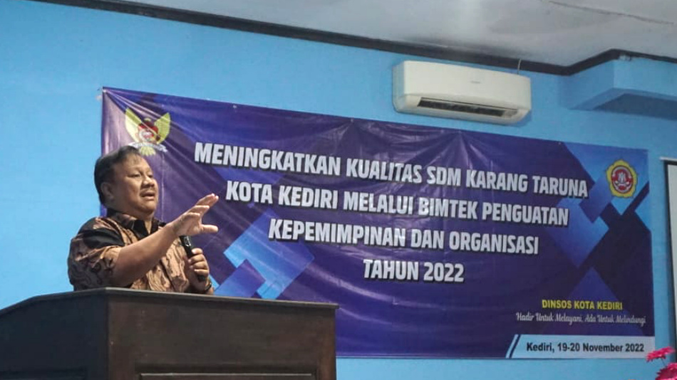 Menyadari potensi besar yang dimiliki oleh Karang Taruna, Pemerintah Kota Kediri melalui Dinas Sosial (Dinsos) mengajak para generasi muda ini untuk berkolaborasi membangun Kota Kediri. Guna mendukung hal tersebut, Dinsos berikan penguatan SDM Karang Taruna melalui bimtek kepemimpinan dan organisasi, Sabtu, (19/11/2022). Foto : Dinas Komunikasi dan Informatika Kota Kediri