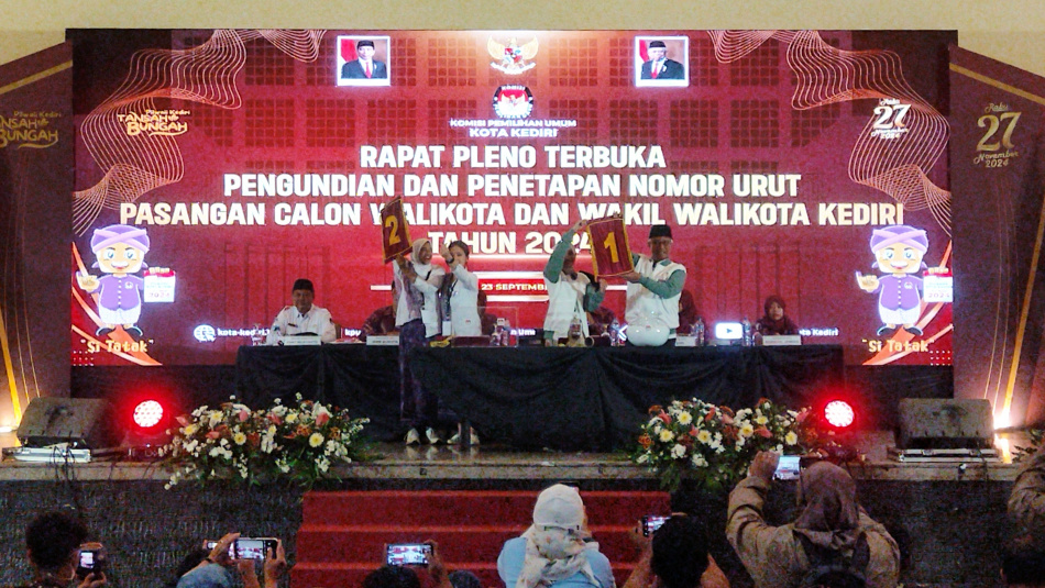 Rapat pleno terbuka pengundian dan penetapan nomor urut pasangan calon Walikota dan Wakil Walikota Kediri tahun 2024 digelar KPU Kota Kediri, berlangsung di Grand Panglima, Kota Kediri, Senin (23/9/2024). Foto : A Rudy Hertanto