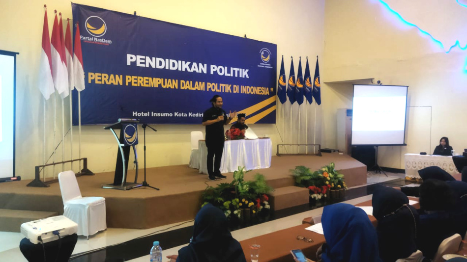 Wakil Ketua Bidang OKK (Organisasi, Kaderisasi dan Keanggotaan), DPD Partai NasDem Kabupaten Kediri, Khusnul Arif (berdiri) saat memberikan paparan pengenalan Partai NasDem kepada peserta pendidikan politik bertajuk peran perempuan dalam politik di Indonesia, digelar DPD Partai NasDem Kabupaten Kediri, Sabtu (24/12/2022). Foto : A Rudy Hertanto
