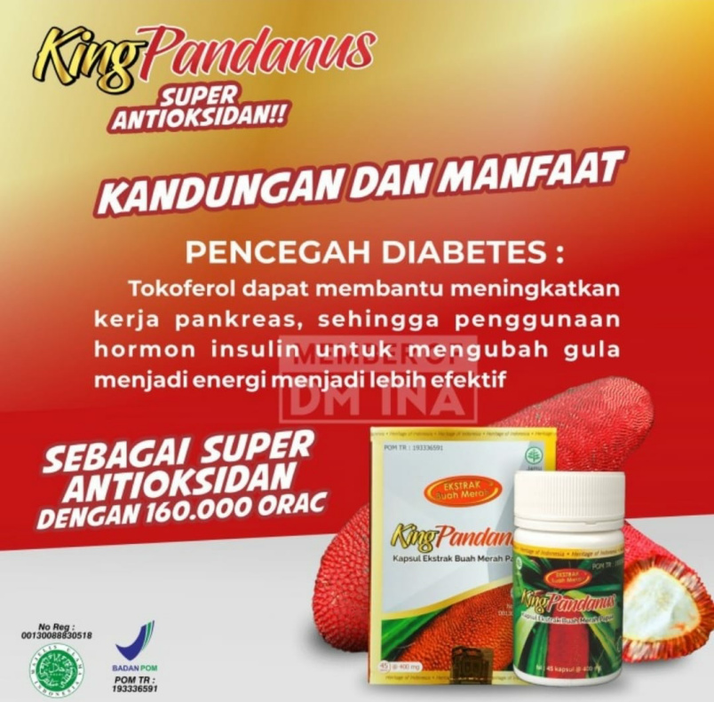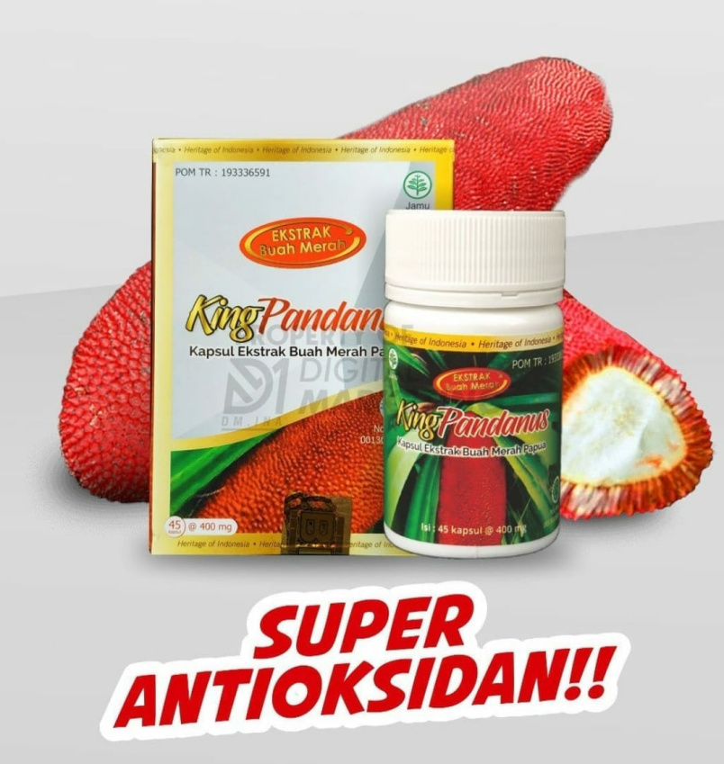 King Pandanus. Super antioksidan, ekstrak buah merah Papua bisa di dapatkan di Radio yang menyiarkan King Pandanus, Apotek, Toko Obat serta Market Place.