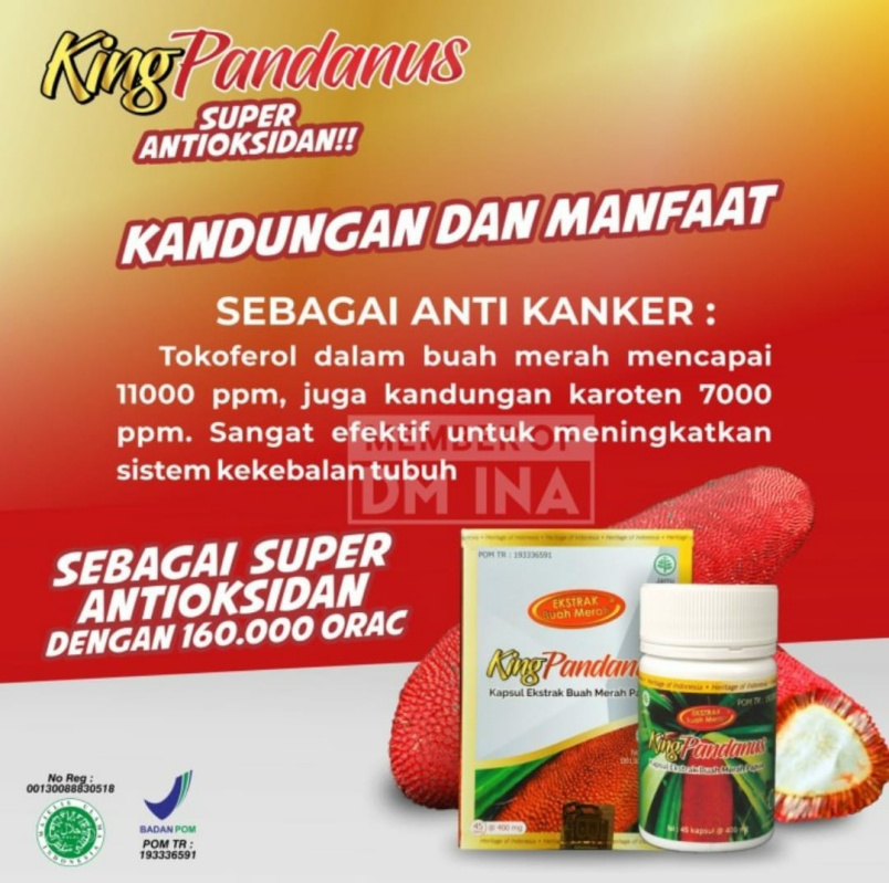 Herbal King Pandanus produksi PT Unimax Power ini memiliki banyak manfaat untuk kesehatan. Mulai dari obat herbal HIV Aids, obat herbal Hepatitis B dan obat anti kanker. Kapsul Herbal King Pandanus yang mengandung ekstrak buah merah ini mampu menghambat pertumbuhan sel kanker, seperti kanker payudara, kanker usus besar dan kanker ovarium.