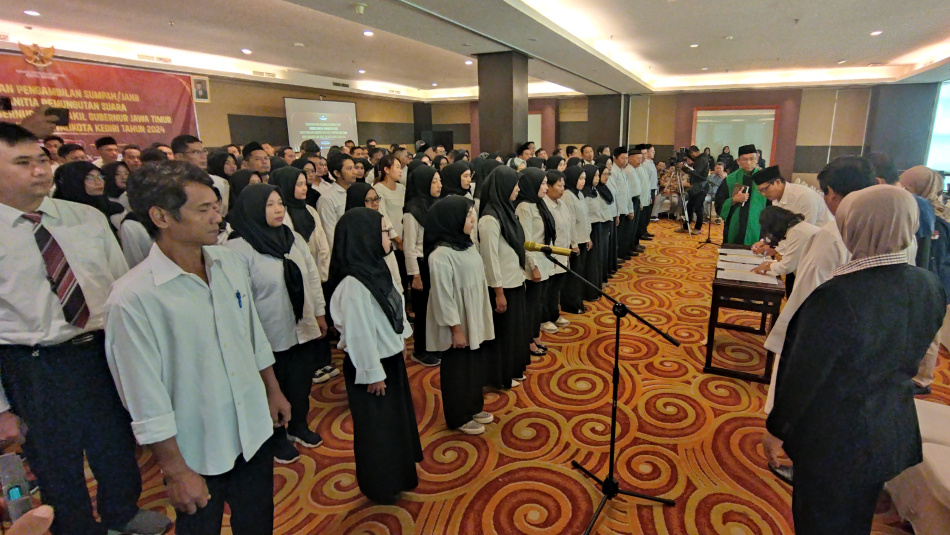 KPU Kota Kediri melakukan pelantikan dan pengambilan sumpah atau janji Anggota Panitia Pemungutan Suara (PPS) untuk Pemilihan Gubernur dan Wakil Gubernur Jawa Timur serta Walikota dan Wakil Walikota tahun 2024, Minggu (26/5/2024). Foto : A Rudy Hertanto