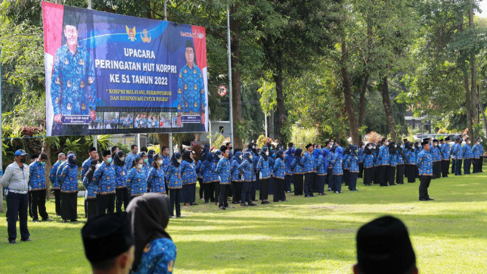 Setelah sejumlah kegiatan digelar untuk memperingati hari ulang tahun KORPRI ke-51, hari ini (29/11/2022) sebagai puncak peringatan HUT KORPRI ke-51, Pemerintah Kota Kediri mengajak perwakilan anggota KORPRI dari berbagai perangkat daerah untuk mengikuti upacara bendera, di Halaman Balaikota Kediri. Foto : Dinas Komunikasi dan Infromatika Kota Kediri
