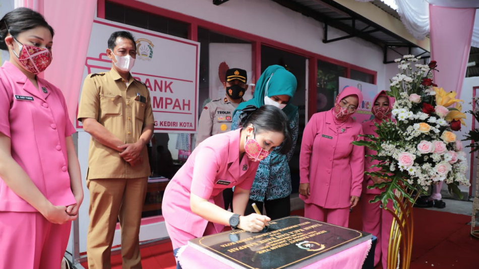 Ketua Bhayangkari Cabang Kediri Kota, Defi Wahyudi didampingi Ketua Penggerak PKK Kota Kediri, Feronica Abdullah Abu Bakar (akrab disapa Bunda Fey) meresmikan penggunaan Taman Baca TK Kemala Bhayangkari 42 Polres Kediri Kota, Senin (31/1/2022). Foto : Polres Kediri Kota